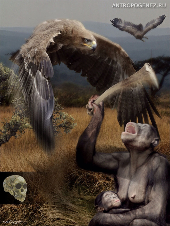 4. Полагают, что «ребёнок из Таунга» погиб в когтях хищной птицы. Об этом говорят характерные повреждения на черепе, в области глазниц — точно такие поклёвы есть на черепах современных павианов и мартышек, угодивших на обед к орлу. Есть, правда, и другие версии — некоторые считают, что детёнышем закусил леопард, но повреждения на черепе слишком мелкие. Кроме того, крупные кошки не оставляют после своей трапезы целых черепов.
