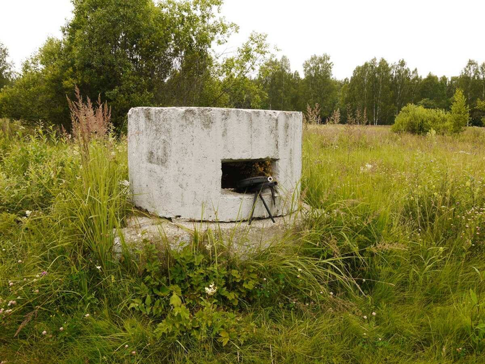 А вот импровизированный дот - сплошное недоразумение. Старый, подлинный дот зачем-то срыли в 79-м, когда делали мемориал. Новый представляет собой бетонное кольцо от колодца, в прорезь приставлено что-то типа пулемета, сделанного из корпуса жигулевского воздушного фильтра, а вместе пулеметной ленты - цепь от бензопилы "Дружба".
