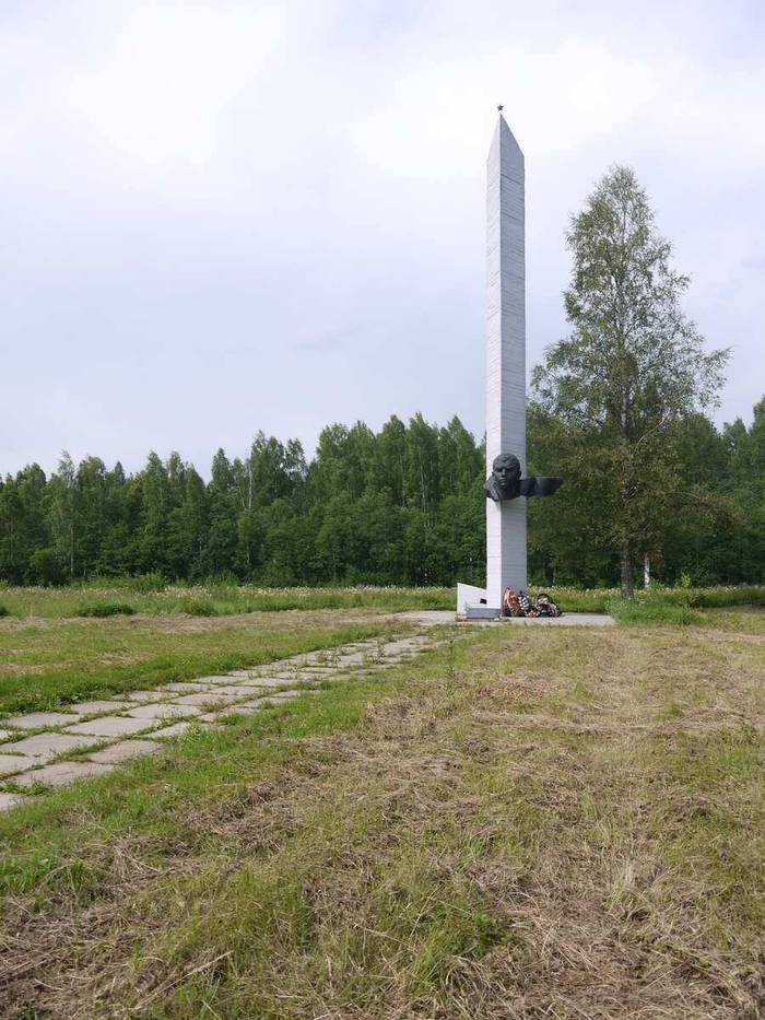 Стела со скульптурным портретом молодого юноши стоит на большой поляне. Вокруг стелы трава заботливо скошена, пахнет сеном. Чуть дальше прорыт ров, вероятно, противопожарный. Чувствуется, что за мемориалом ухаживают.