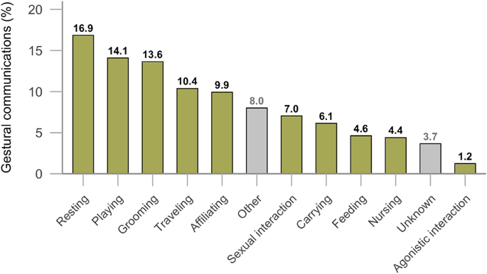 Наиболее частыми оказались 16 сигналов. Среди них толчок, преподнесение, захват, прикосновение, перемещение и удары по объекту, напряжённая стойка, взгляд, вытягивание руки, удар по собеседнику, демонстративная походка, объятие и длительное прикосновение. Около 75% этих жестов совпадают с арсеналом шимпанзе. После таких «разговоров» гориллы нередко переходили к другим видам взаимодействия — например, ухаживанию за шерстью, и здесь они использовали уже уникальные движения.