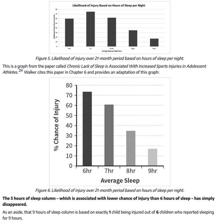 Вообще, для того, чтобы смухлевать, не обязательно врать. Можно просто вырвать цитату из контекста или предоставить лишь фрагмент исходных данных. Мэттью Уолкер в своём бестселлере «Почему мы спим» демонстрировал зависимость вероятности травмы атлета от времени сна. Он явно хотел показать, как важно высыпаться. Всё бы хорошо, но он привёл не все данные. На самом деле вероятность травмы росла при уменьшении времени до 6 часов, но при дальнейшем уменьшении она падала.