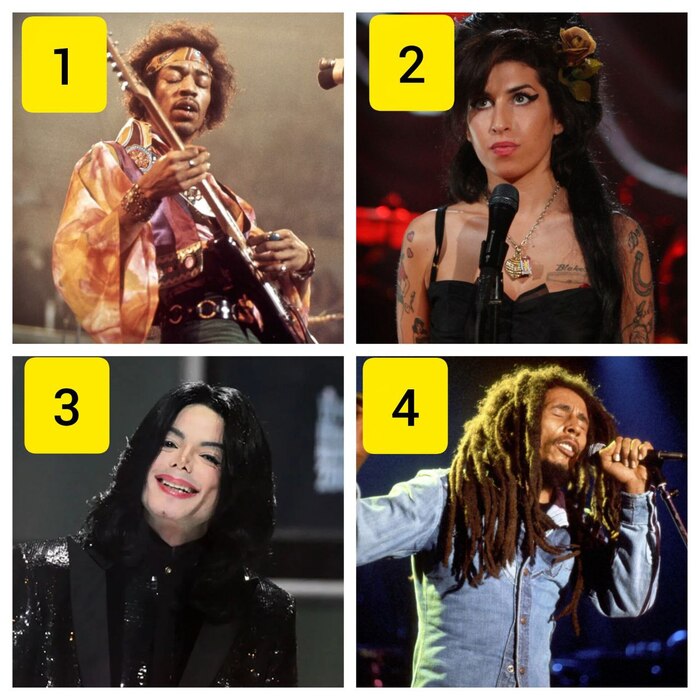 Ответ: Боб Марли умер от агрессивной формы меланомы. Джими передознулся и захлебнулся собственной рвотой. Эми спилась до смерти. Джексона передознул врач снотворным.