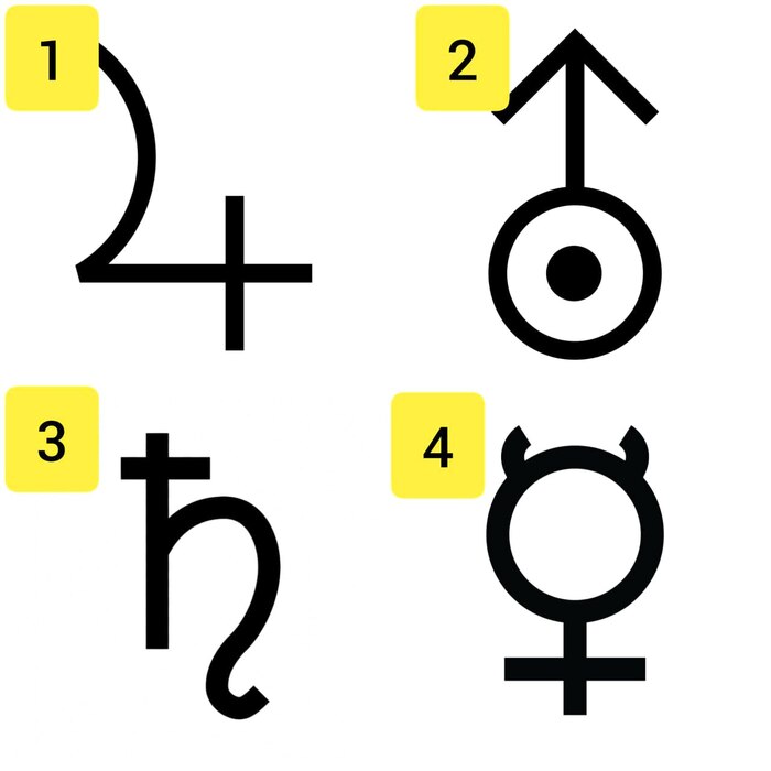 Ответ: 1 — Юпитер, а также олово; 2 — Уран; 3 — Сатурн, он же свинец; 4 — Меркурий, он же ртуть.