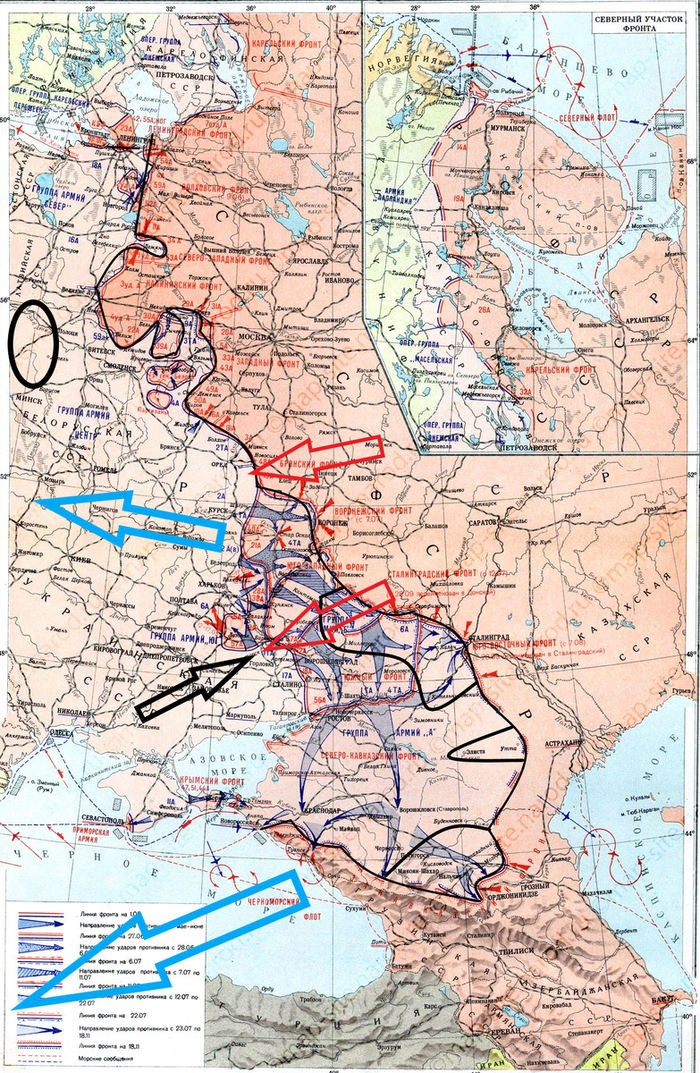 На картах красными стрелками обозначены основные удары советских войск, чёрными немецких и их союзников, голубыми направления основных событий на других театрах военных действий, жёлтыми границы отвоёванных территорий при наступлении той или другой стороны.