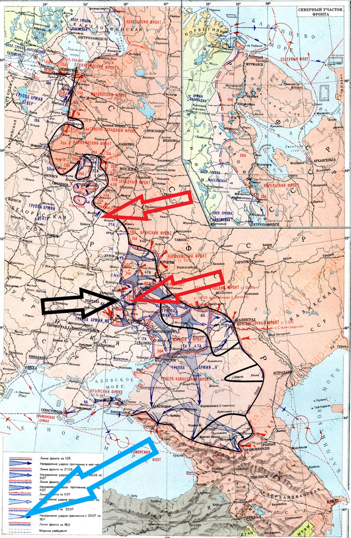 На картах красными стрелками обозначены основные удары советских войск, чёрными немецких и их союзников, голубыми направления основных событий на других театрах военных действий, жёлтыми границы отвоёванных территорий при наступлении той или другой стороны.
