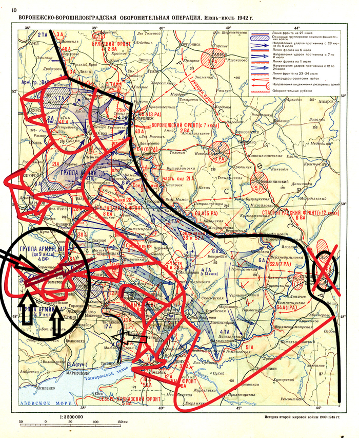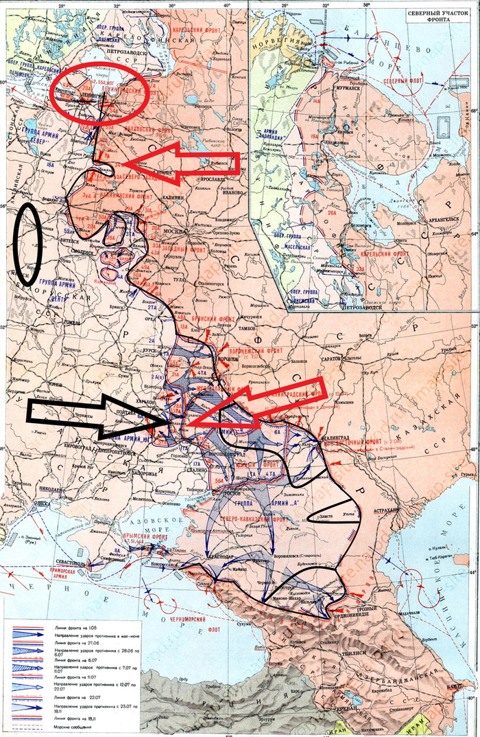 На картах красными стрелками обозначены основные удары советских войск, чёрными немецких и их союзников, голубыми направления основных событий на других театрах военных действий, жёлтыми границы отвоёванных территорий при наступлении той или другой стороны.